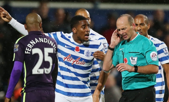Hart had a wild night, mixing moments of catastrophe like that with wonderful saves. He sprawled full stretch to his right to palm aside Austin’s next effort after 13 minutes when Zamora cleverly nodded the ball into his path. Later, when Austin broke clear in the area again after a Fernando howler and put his laces through the ball, the England keeper thrust up an arm and rescued his team once more. But in the second half he could be found seeking out QPR fans halfway up the Ellerslie Road stand with wayward kicks. At the other end, Green scrambled a mishit Aguero volley away. City couldn’t live with their hosts. QPR were completely dominant. In an attempt to hang onto Rangers’ coat tails, the visitors took to disrupting the play with fouls. Clichy, having a torrid time at left back, hauled back Maurcio Isla, then five minutes later Fernandinho slid into Karl Henry and 60 seconds later still Samir Nasri tripped Charlie Austin. Referee Mike Dean, apparently taking into account the early time on time on the clock, the slippery conditions, and the fact that all three players were committing their first offences, kept his yellow card in his pocket. Then, inexplicably, the Wirral official started to persecute QPR. Sandro was immediately booked for his first foul on Yaya Toure and he was followed into the book at ridiculous speed by three team mates — Isla for fouling Sergio Aguero, Richard Dunne for a tackle on Nasri, and then Vargas for fouling Fernandinho. Loftus Road howled with indignation. The big-club conspiracy theorists added paper to their files. A clearer example of one rule for one… you’ll rarely see. In actual fact it helped. The crowd, already on the rowdy side of raucous, cranked it up another notch. Despite the refereeing and the disallowed goals Rangers remained in full stride. They took a richly deserved lead on 19 minutes when Isla made the most of Clichy’s latest slip to feed Austin in space — and, crucially, just onside — and he finished crisply past Hart and into the corner. He was quickly buried under a pile of team mates.