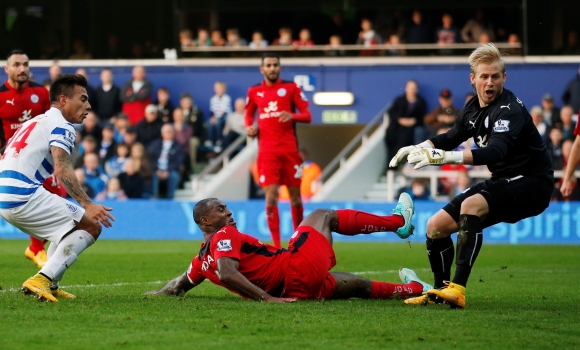 But let’s not pretend QPR were dominating completely - unlucky to concede early in the game and destined to assert superiority thereafter. Leicester should have made it 2-0 before Morgan’s personal disaster: Onuoha slow to recognise a problem with Vardy in the right channel and allowing a low cross to come in that Mahrez should have converted from close range. From the kick off (from the kick off!) Jamie Vardy raced through on goal onto a fine pass from Mahrez but found Green in determined form and able to produce a block. Mahrez, incidentally, never fails to impress me when I see Leicester. Nigel Pearson, with no wins from seven going into this game, took him off and sent on Marc Albrighton after an hour, and the former Villa man contributed next to nothing to the final half hour. Answers on a post card, addressed to Leicester’s no-doubt-concerned Malaysian owners please. Only QPR could struggle to defend kick offs. The equaliser did nothing to calm this relentless cartoon of a football match. Rangers led at half time. Joey Barton’s well flighted cross to the back post found Charlie Austin arriving late and although his powerful header was blocked by Schmeichel, Leroy Fer was on hand to smash the rebound into the ground and up into the roof of the net. Austin, who is growing into his role as a Premier League striker and will surely be attracting agent-inspired newspaper headlines about big money moves shortly, would have scored that nine times out of ten, and may find profit in late penalty box arrivals moving forwards. His leap is so prodigious that no centre half can deal with it, and on this occasion the timing was all about him having to put his boot back on before he could run forwards.