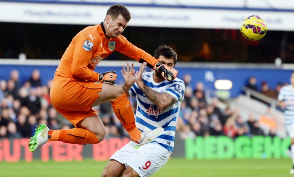 But that was about the first time the home team had strung three passes together. On a frosty pitch that suggests worrying problems with the undersoil heating in W12, Burnley were much the better side in the first half. Their full back Kieran Trippier is a well-known assassin — 14 assists and three goals from the right side of the Clarets’ defence last season — and his early searching cross drew Robert Green from his line into a situation he didn’t want to be in. The goalkeeper collided with Mauricio Isla, spilling the ball in the process, but recovered well to make a fine save as Scott Arfield seemed certain to slam in the rebound. Later Green flung himself off to his left to spectacularly fingertip George Boyd’s top-corner-bound 25 yarder onto the top of the post. As good a save as you’ll ever see from one of the Premier League’s form goalkeepers. Given Simon Mignolet’s struggles at Liverpool, you’d forgive Green’s reserve Alex McCarthy the odd regret for choosing Loftus Road over Anfield in the summer during his quieter moments — Green has rarely played better in his whole career than he has in the last month. QPR were losing the midfield battle comprehensively. Joey Barton was back in Hollywood mode, attempting passes and long range shots his ability simply cannot justify. Karl Henry seemed a yard off the pace after clashing heads with Boyd — all flowing hair and slender figure: you’ve pulled worse. David Jones and Dean Marney were workmanlike and effective, Boyd and Arfield wide of them impressive, QPR were struggling. Jones saw a free kick, awarded for a foul by Barton on Danny Ings, deflect over off the top of the wall. Later Trippier lashed wide after Isla committed a stupid foul on Ben Mee, when the left full back had his back to Green and was going nowhere, and the free kick was cleared out to him.