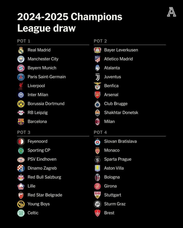| Brest on 18:28 - Aug 29 with 6491 views | DannyPaddox | Teams will be placed in four pots according to their seeding. Each team face two teams from each pot, one at home and one away. A team will be drawn out of a pot and then Uefa's software will decide their eight opponents - and whether they will be at home or away. And that’s numberwang! |  | |  |
