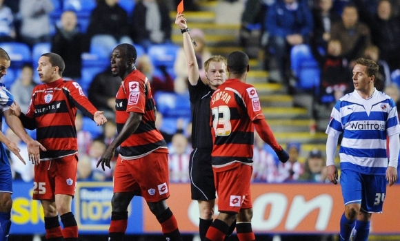 Reading 1 QPR 0, Tuesday March 16, 2010, Championship QPR didn’t get the best of luck with refereeing decisions in their two meetings with Reading the previous season either, particularly in the game at the Madejski Stadium where our old friend Gavin Ward was in vintage form with the whistle. At the time both teams were enjoying resurgences under new management with Neil Warnock and Brian McDermott leading their sides up the table after winter relegation fights. Young referee Ward took centre stage by sending Damion Stewart off just before half time under heavy duress from Reading ’s three man refereeing committee and then awarding the Royals a late penalty which was converted by Gylfi Sigudsson for a 1-0 win. Reading: Federici, Griffin , Mills, Ingimarsson, Bertrand, Kebe,Tabb, Sigurdsson, Howard (Rasiak 61), McAnuff, Long (Church 67) Subs Not Used: Hamer, Gunnarsson, Matejovsky, Robson-Kanu, Khizanishvili Booked: Rasiak (diving) Goals: Sigurdsson 85 (penalty) QPR: Ikeme 7, Connolly 7, Stewart 6, Gorkss 8, Hill 7, Faurlin 7, Leigertwood 6, Priskin 6 (German 87), Taarabt 7 (Ramage 80, -), Ephraim 6 (Cook 90, -), Simpson 7 Subs Not Used: Cerny, Cook, Vine, Buzsaky, Borrowdale Booked: Faurlin (foul), Leigertwood (repetitive fouling), Hill (foul), Connolly (dissent) Sent Off: Stewart (two bookings — foul, obstructing goalkeeper)