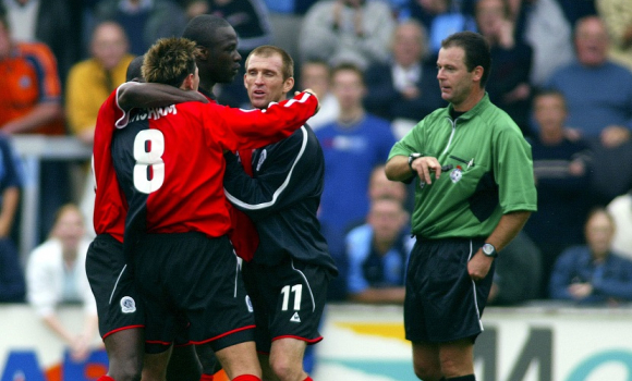 It began, like so many QPR games that season, with a close range finish from Scottish forward Andy Thomson after a fumble on the goal line by visiting keeper Martin Taylor. So far, so predictable, goal 18 of 21 for Thomson in 2001/02. And having suffered Prosser’s comedy stylings previously, you couldn’t really say it was much of a surprise when Rammell hit the deck under a cross that had long since passed him by, and with minimal contact from Terrell Forbes, and was awarded a penalty — Steve Brown happy to send Fraser Digby the wrong way. Then things got fun. On the stroke of half time, seizing on a probing pass by young left back Danny Murphy, Kevin Gallen decided to try his luck with the Prosser wheel of doom and hit the deck. If he’s reading this, maybe he’d like to fess up, or say I’m wrong, but I’d have been fuming if that had been given against us. And Wycombe were indeed jolly cross about it, Jermaine McSporran first on the scene first with a spray and shove for Gallen, then with an aggressive push and shove with the referee in the middle of it, resulting in a red card. Quite why Danny Senda was then also sent off remains a mystery to this day, but that was Wycombe down to nine men, and of course from there QPR missed the penalty anyway because that’s what QPR do — Thomson putting the kick at a nice height for Taylor to dive left and save.