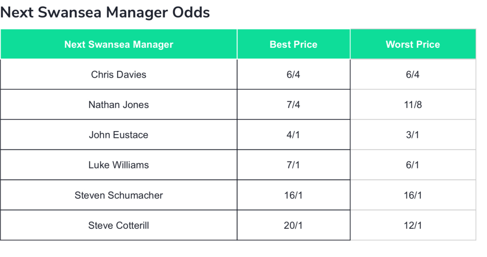 Latest odds explored on new head coach & a few outsiders Tuesday, 5th Dec 2023 18:40 by Keith Haynes & Liam Walters Andrew Coleman is playing his cards close to his chest regards his appointment of a new head coach at Swansea City. The main front runner seems to be a long shot when a sensible moment of clarity is taken. The name is Chris Davies but he is assistant to Postecoglou at Spurs and is a part of an ever increasing and exciting project there. He turned the Swans down in the summer. ⚽️ Odds check : Chris Davies is the 6/4 favourite to replace Michael Duff at Swansea on BetVictor (implied 40% chance). The 38-year-old who worked with Brendan Rodgers at Liverpool for more than three years, including the Reds' 2013/14 title tussle with Manchester City. He has held multiple positions under Rodgers, firstly with Swansea before following his time at Liverpool with a spell as assistant at Celtic and Leicester. He was appointed senior assistant coach to Ange Postecoglou at Tottenham in June of this year. Mere mention of the name Nathan Jones is getting the children on Twitter X in to a spin. The usual contenders as well. The fact is that Jones is in the running, but only with the bookies. Remember they chuck in a few obvious names, you get hooked and you bet on it. That’s why they make money. Surely Coleman won’t go anywhere near him ? The facts are that Duff was on a hiding to nothing after such a poor run - which basically was relegation form. You have to admire Coleman’s reaction to that, he is no fool and has more than enough business acumen to apply to this latest roller coaster. However, him and Ken Gude have no experience in this part of running the club. It’s a dangerous game, and we are hoping there is some steady influence from Paul Watson. On that he is extremely friendly with Nathan Jones, he recently turned down the Rotherham United job, so with these two factors in play you have to pay it some attention. However, his experiences at Southampton led him to being the quickest sacking in the clubs history. ⚽️ Latest contenders : ![]() If this is correct it’s pretty disappointing, however the Swans rarely if at all go with the bookies. An astute but expensive outside option is Graham Potter. Since leaving the Swans he had a meteoric rise to the top of the Premier League. First installing Brighton as a quality Premier League club and then a pretty bad time at Chelsea. If the Swans are serious about this crucial appointment then Potter would be very well received. However, it is a money talks situation. Kevin Muscat would also be very well received, he is currently the manager of Yokohama F. Marinos in Japan. He won the J1 League with Yokohama in 2022, and has a 57% win rate over two years. His Japan Super Cup win this year merely enforced his credentials. There has to be some caution as well, he managed Sint-Truidense in Belgium and had an appalling win rate (13%) and was sacked after six months. Frank Lampard would be a risk, but he is out of work, we are really not sure about him. Ole Gunnar Solskjaer wouldn’t be a welcome choice for obvious reasons. For us if you want to be serious about your next coach, and you want a true expert in the field then Hansi Flick is your man. Yes, it’s a very expensive choice but messing around at Steve Cotterill level is a non starter. It will end in another sacking and a pointless waste of time. Ex Cheltenham managers are to be avoided ! Be bold and be brave, spend the cash, and get in the right man for the job who has excelled at the top. Yes Flick is just a chat over a pint for those sensible enough to understand adult chat. But that’s the level any club needs to reach if it is serious about their future. But have the Swans got over cheap appointments and gambles ? That’s the real question. ![]() Photographs licensed from Reuters Please report offensive, libellous or inappropriate posts by using the links provided.