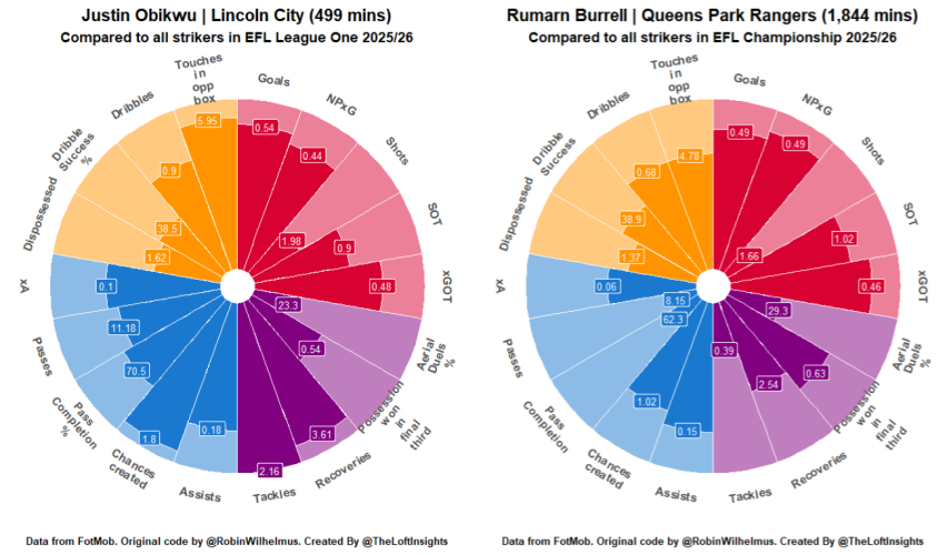 Coventry's Obikwu brings familiar profile to QPR attack - Signing Thursday, 22nd Jan 2026 16:54 by Clive Whittingham and Zac Bowles Rumarn Burrell’s absence has shown the flaws in QPR’s current system without a striker of his profile at the top of the formation – welcome, then, Burrell’s non-union Coventry equivalent Justin Obikwu. FactsJustin Obikwu is a 6ft 4ins tall Brent-born striker who is joining QPR from Coventry City for a reported fee in the region of £500k. Obikwu joined the Sky Blues as a teenager from our nearby non-league outfit Harefield United and signed his first professional contract there in the summer of 2023. After a first half of the season spent in Coventry’s U21 side he spent the second half of 2023/24 on loan at League Two Grimsby. He made ten starts and six sub appearances for the Blundell park outfit, scoring three goals including his first ever professional strike in a 1-1 away draw at Sutton. That, and goals for Cov in pre-season against Port Vale and Stevenage, was enough for Town to take him on a full season loan for 2024/25. Manager David Artell said: “We’ve done unbelievably well to get him back because his progression has been so rapid since he was here. He could have gone to four League One clubs, so the fact that he’s chosen us, ahead of them, is a real bonus. “ He went on to start 15 league and cup games and made seven sub appearances with seven goals scored, including a brace in a 3-0 away win at Morecambe and a hot streak of three in three against Bromley, Carlisle and Doncaster in February. His progress was interrupted two thirds of the way through the campaign by a car accident after that game at Donny. Despite the relatively limited appearance record his performances were enough for League One Lincoln to beat their near neighbours to the loan signature for 2025/26 and in this first half of this season he’s started five times and come off the bench on 16 occasions for the Imps. He’s scored in wins against Luton, Peterborough and a defeat at Wycombe for Michael Skubala’s promotion chasers. Obikwu represents Trinidad and Tobago at international level, making his competitive debut against Curacao in World Cup qualifying in September and so far winning four caps. He now joins QPR permanently on a contract of REDACTED length. He’s effectively being replaced at Lincoln by Alfie Lloyd, who has been recalled from a loan at Orient and sent to Sincil Bank instead. Analysis – Zac Bowles @TheLoftInsightsQPR have picked up where they left off last summer with another signing of a promising striker with League One experience, and as with the Kone and Burrell pick ups there’s plenty to like about this one. Justin Obikwu has spent the first half of the 2025/26 season on loan at League One Lincoln Town, where he made 17 appearances (including four starts), contributing three goals and one assist. Many comparisons have been drawn between Obikwu and summer arrival Burrell, and looking at the underlying numbers, it is clear to see why. ![]() Obikwu and Burrell share a very similar profile; highly mobile, eager to press, instinctive goalscorers. So, let’s break down the numbers. Goal Threat There are two standout statistics that demonstrate Obikwu’s goalscoring ability; (1) NPxG/90, which measures the quality of the chances Obikwu takes, and (2) xGOT/90, which measures the quality of his shooting from these positions. Obikwu’s high NPxG/90 (0.44, top 21% of League One strikers) indicates how he consistently gets himself into dangerous areas, producing high-quality goalscoring opportunities. From these threatening positions, Obikwu shoots well, as we can see from his strong xGOT/90 performance (0.48, top 24% of League One strikers). Looking at his goal against Luton, we can see this strong finishing ability on display as Obikwu converts beautifully from a 1-on-1 situation. Against Wycombe, Obikwu combines his ability to find space in the box and finish well to score with his first touch of the ball, coming on as a substitute just moments before. On top of this, Obikwu’s strength with both feet adds an element of unpredictability and versatility to his finishing, allowing him to capitalise on chances from many different positions. General Play: In Possession On the ball, Obikwu looks confident. He is not afraid to receive the ball and drive forward, or operate in tight areas. However, his low dribble success rate (38.5%, bottom 53% among League One strikers) indicates that his dribbling output needs to improve if he wants to develop his game. Playing alongside another striker in a 4-4-2, Obikwu is confident linking up with his teammates to create chances; a tidy one-two earned him an assist against Luton. This is a really important element of his game, producing 1.8 chances/90 (top 7% among League One strikers). In this regard, he outperforms Burrell (1.02 chances/90) statistically. However, it is off the ball where I think Obikwu really shines. He is incredibly eager to run in behind, constantly looking to drift into the wide spaces to receive through balls. Looking at his touch map (source: Opta), we can see how he moves across the front line and into these wide areas. ![]() Given Stephan’s desire for his team to counter-attack directly, QPR play to Obikwu’s strengths well. By constantly threatening to run in behind, Obikwu stretches and disrupts the defence, who must adjust or else risk allowing Obikwu in on goal, where he is incredibly dangerous due to his finishing ability. One way in which Obikwu can improve is his ability to hold his run, as he is often caught offside (1.25 offsides/90). Due to his superior pace and finishing, he can afford to hold his run in order to make the most of these chances. Out of Possession Another way in which Obikwu suits Stephan’s preferences is through his work rate off the ball. Obikwu, like Burrell, is a constant menace for defences, pressing with high energy and persistence. While Steph