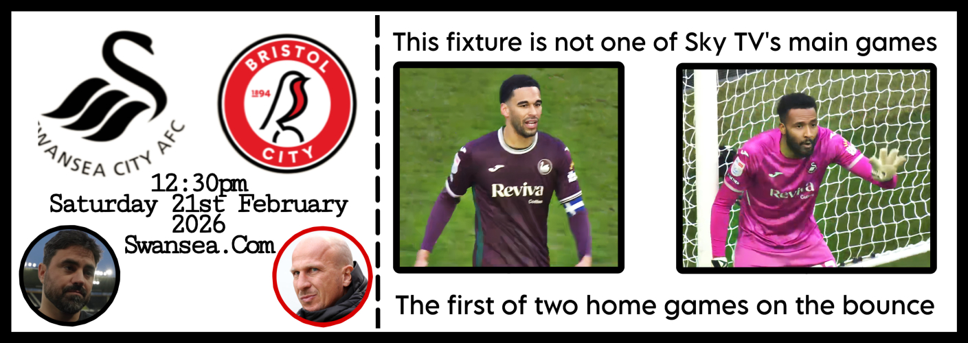 | Swansea City v Bristol City : Match day thread on 14:00 - Feb 18 with 1095 views | KeithHaynes | Swansea City : Matos faces a huge test 18th Feb 2026 08:00Swansea City set out on a journey of two home games over four days this coming Saturday and then Tuesday evening. Saturday brings Bristol City (12:30pm) and Tuesday, Preston North End (7:45pm) Both games are winnable of course but will prove a lot harder than the two against Portsmouth and Oxford United. 0 |  |