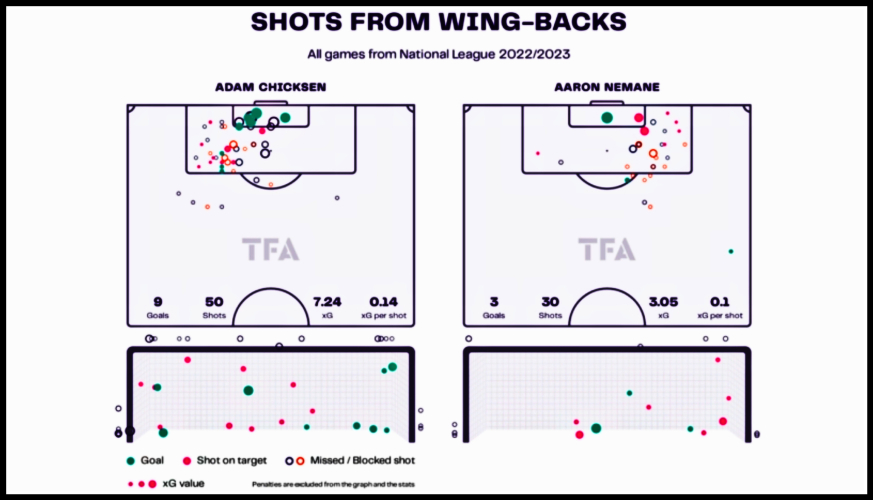 Luke Williams will without doubt look to utilise players Josh Key and Josh Tymon as much as possible in both wing back positions. Both should be excited by the opportunity to play so high in William’s favoured 3-4-2-1 shape. Interchanging positions is a key part of the first phase, and when looking at how county move into the mid phase it really identifies the relationship between wing back and corresponding attacking midfielder as the most important part of his system. We can expect both wing backs to show no hesitation when progressing into high attacking positions. The wing back on the side of play will always look to make a run past the opposition’s full back. Close to his position will be the corresponding attacking midfielder. When the final ball is played, the other wing back stays occupied by making a darting run forward into the final third, with no interest in dropping deep to defend. This is a recurring feature of William’s tactics and it often leads to dangerous chances from wider areas. Adam Chicksen recorded 50 shots in the National League 22/23 season from left wing back. Aaron Nemane on the opposite flank recoded 30 shots. Between them they scored 12 goals. With the quality of Key and Tymon you’d expect the return to be higher.