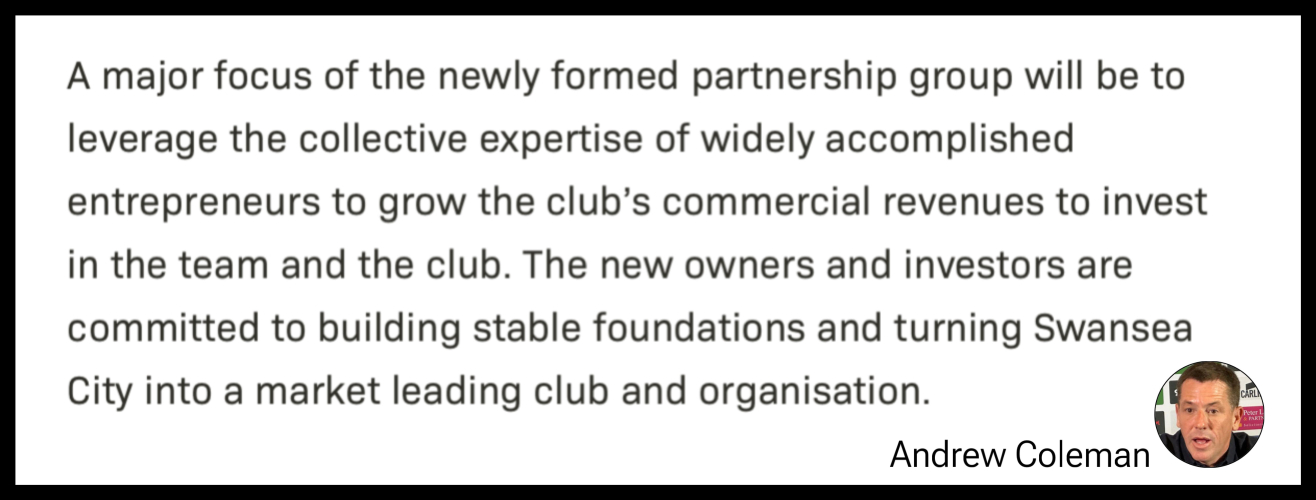 Swansea City : This is not a hedge fund, we explore the new people involved Saturday, 23rd Nov 2024 15:20 by Liam Walters If there has ever been a fresh feel to the club this week then Swans Chairman Andrew Coleman signifies that. His whirlwind approach to the ‘coup’ that saw Jason Levien and Steve Kaplan leave Swansea City under agreement two weeks ago is making pace. We call it a coup because long before this summer Coleman was a frustrated individual caught up in the vagrancies of an extraordinary USA investment tool referred to as an LLC, plus the constraints of majority shareholders Jason Levien & Steve Kaplan. Coleman certainly ran issues at the club but these two were restricting his financial movement and lessening the Swans spending power and ability to manage a Championship club. However, they were not the whole villains of the piece, a series of poorly judged managerial decisions and appointments within the club have to be analysed over time. That is something we have done since last May and indeed since we have run Swansea Independent. At times a series of calls have to be made based on judgement, knowledge and indeed without compromising sources. That’s ensconced in our internet history. Now though we have to refer to the new boys in at the club. For reference our three reports over October and November are good starting points. ![]() 1. ⚽️ Levien & Kaplan to leave ? 2. ⚽️ Tyler Morse to come in ? 3. ⚽️ Its full steam ahead ![]() With those reports under your belt the future is now open to discussion. First off with Tyler Morse already a known entity, we look at those now newly appointed to the Swansea City board of directors. You won’t find these names on the official site map just yet, but as always, you can trust the following information. So, what’s the latest news on those new directors ? ⚽️ Jason Cohen is no stranger to one of the majority shareholders, Brett Cravatt. In a nutshell they have numerous business partnerships in the USA. They both have a pretty succesful pathway in business. Magdellan equities is their latest venture. Prior to Magellan, Brett Cravatt and Jason Cohen founded, developed, and scaled one of the nation’s leading technology-enabled customer acquisition businesses, Centerfield. Cravatt and Cohen grew Centerfield from inception to over 2,500 global employees, $550mm+ of revenue and upwards of $150mm per annum in EBITDA. (earnings before interest, taxes, depreciation, and amortisation) There revenue stream is sound. Both live in California and are married with children. ⚽️ George Popstefanov : Born in Macedonia and raised in the country but at seventeen his parents had sufficient money to send him to ‘finishing school’ in the USA. He is now CEO of PMG Advertising a compkany going all out for respect in the advertising industry. They regularly report huge profits in the millions of dollars each year. In a two-week span in 2023, PMG acquired Camelot Strategic Marketing & Media and Rocket Mill. The two businesses added more than $50 million in revenue to the system. The company is on target to do nearly $7 billion in media billings for its clients. And they now include Apple and Nike. ⚽️ Chris Sznewajs (SwansJacks) ! Is the Managing Partner, Founder and Investment Committee Member of Pacific Avenue Capital Partners. Sznewajs is responsible for overseeing all aspects of the firm’s investment activities along with chairing the Boards of the active portfolio companies. Andrew Coleman seems to be a man with a new lease of life now surrounded by what he perceives to be honest and genuine people with a solid investment track record. This is not in any way the same as the way the club was purchased with a long list of investments via a hedge fund back in 2016. These are openly appointed individuals to the Swansea City board who are known and transparent. ![]() It is great news to hear the diligence is complete, but that really was never a concern. Much of the twenty million pounds invested will go into the clubs running costs, daily structure and forwarding things already in place at the club. There will be a big emphasis on the academy and all inclusive sports development. This will interest many companies within Wales we expect. The Swans will provide a more open environment for businesses to attach their companies to. That has been difficult until now. ![]() The standing of Martin Morgan and Huw Jenkins is yet to be divulged but a look back in history to 2016 saw them heavily involved. This is obviously no longer the case but minority interest remains. April 2016 : Guardian report, David Conn, Jenkins’ 13.2% stake, which cost him £125,000 to buy, is valued at £13.2m. He is understood not to be planning to sell all his shares and is likely to remain the chairman if the takeover completes, because he is widely credited with having run the club with great acumen, alongside the other directors. The local hotelier Martin Morgan and his wife, Louisa, are the largest shareholders with a 23.7% stake, which cost £225,000 to buy; it is now valued by Kaplan and Levien at around £23.7m. Martin Morgan is said not to be intending to sell, and Levien may try to have separate discussions with Louisa Morgan, who controls more than half of their stake. How times change. ![]() We also have to keep an eye on this European idea that was hatched by Andrew Coleman and the Noel Mooney connection at the Football Association of Wales. Mooney is the Chief Executive of the FAW who doesn’t always hold the fans best regard. This still concerns us, Newport County at the time of this going to press were not even aware of the details of the document presented to Mooney at the FAW. Our site owner, went on BBC Wales as a guest and questioned the whole strategy and reasoning. Agreed in some degree with host Rob Phillips and Nathan Blake, it all just seemed pie in the sky. We await developments on that. Mooney commented today. Time for a few 
