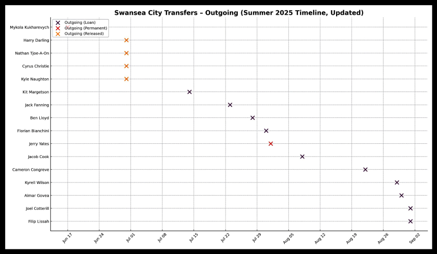 Swansea City : Late night review of the summer on deadline night Monday, 1st Sep 2025 22:58 by Liam Walters With Manuel Benson to be officially announced from Burnley we thought a late night look at this summer dealings would help clear your heads. Or make them more misty. There could be one more but information on that is sketchy. We have two diagrams for you to look at. ![]() ![]() This should prepare you for our report tomorrow where we look at the acfual outgoings and costs invovled over this summer. It’s helped us. And we all need a little help sometimes. We also hope that you have enjoyed our ticker tape day. It’s been a blast … ![]() Apologies to our Joe, we will update it fully in the morning. Artwork by Swansea Independent Please report offensive, libellous or inappropriate posts by using the links provided.