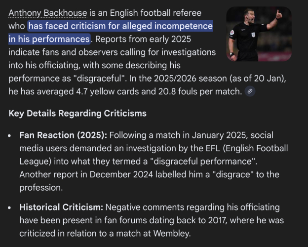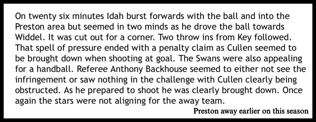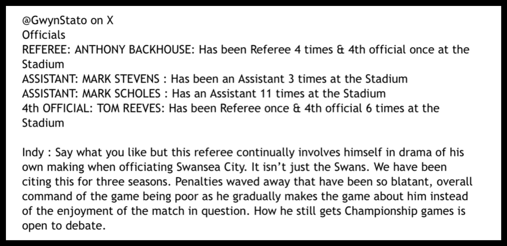 Swans focus : Anthony Backhouse : Is he fit to referee ? Sunday, 1st Mar 2026 10:50 by Liam Walters & Keith Haynes When we see certain officials tied to Swansea City games it’s only fair we look back on their performances when officiating other Swansea City fixtures. Anthony Backhouse is one of those who always fills us with dread. His game management is often flawed and on far too many occasions he has determined the outcome of Swansea football matches. Yesterday, yes the Swans were pretty poor in all areas and in no way deserved anything after a pitiful collapse from minute one to the end of the game. However, there were two key moments again where Backhouse dismissed Swansea penalties. The first a clumsy challenge on Melker Widell, the second a blatant penalty after an obvious shirt pull on Marko Stamenić. Backhouse dismissed both and on both occasions didn’t seek out the ‘assistance’ of the referee’s assistant. ⚽️ Melker Widell claim ![]() ⚽️ Marko Stamenić claim ![]() As stated this isn’t the reason why the Swans lost this game, but it signifies Backhouse as the factor why the Swans have so many penalty appeals dismissed by him. Being a website that reports on all Swansea City matters there is a trail of examples involving this referee.. ⚽️ Oct 2023 ⚽️ WBA 2024 ⚽️ Dec 2025 We did give fair warning of the exceptional qualities of Anthony Backhouse pre match on our match day thread for yesterday’s game. That was on our thread all week. ![]() And another example of his superb intuition at Preston away this season. ![]() There are numerous other pieces of evidence that will either point to his incompetence when officiating a Championship football match involving the Swans or indeed allegations of his fitness to be involved at such a high level of competition. Either way he is influencing and has influenced for a few seasons football matches where Swansea City are involved. ![]() Other clubs and reporters are getting the same raw deals. ![]() There are so many other examples it is becoming an embarrassment to the English Football League surely ? Almost every other week he gets very poor remarks on his performance, that comes from all manner of critics, not just fans. Will the EFL do anything about his game management because if he was a Premier League referee he would be downgraded to the Championship or League One. ![]() And that’s the reason why Swansea City and many other clubs have to put up with him. ![]() ![]() ⚽️ Go to this page and find out more It could save your life. Photograph : Swansea City AFC Please report offensive, libellous or inappropriate posts by using the links provided.